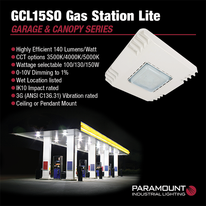 Announcing the all-new GCL15SO Gas Station Lite from Paramount. Designed for Gas Stations, Canopy or Car Park applications, this highly efficient, wet location LED luminaire provides superior illumination, critical for ensuring safety, visibility and operational efficiency in modern facilities. The high lumen output, wide beam angle, and advanced technology provides a welcoming public atmosphere a